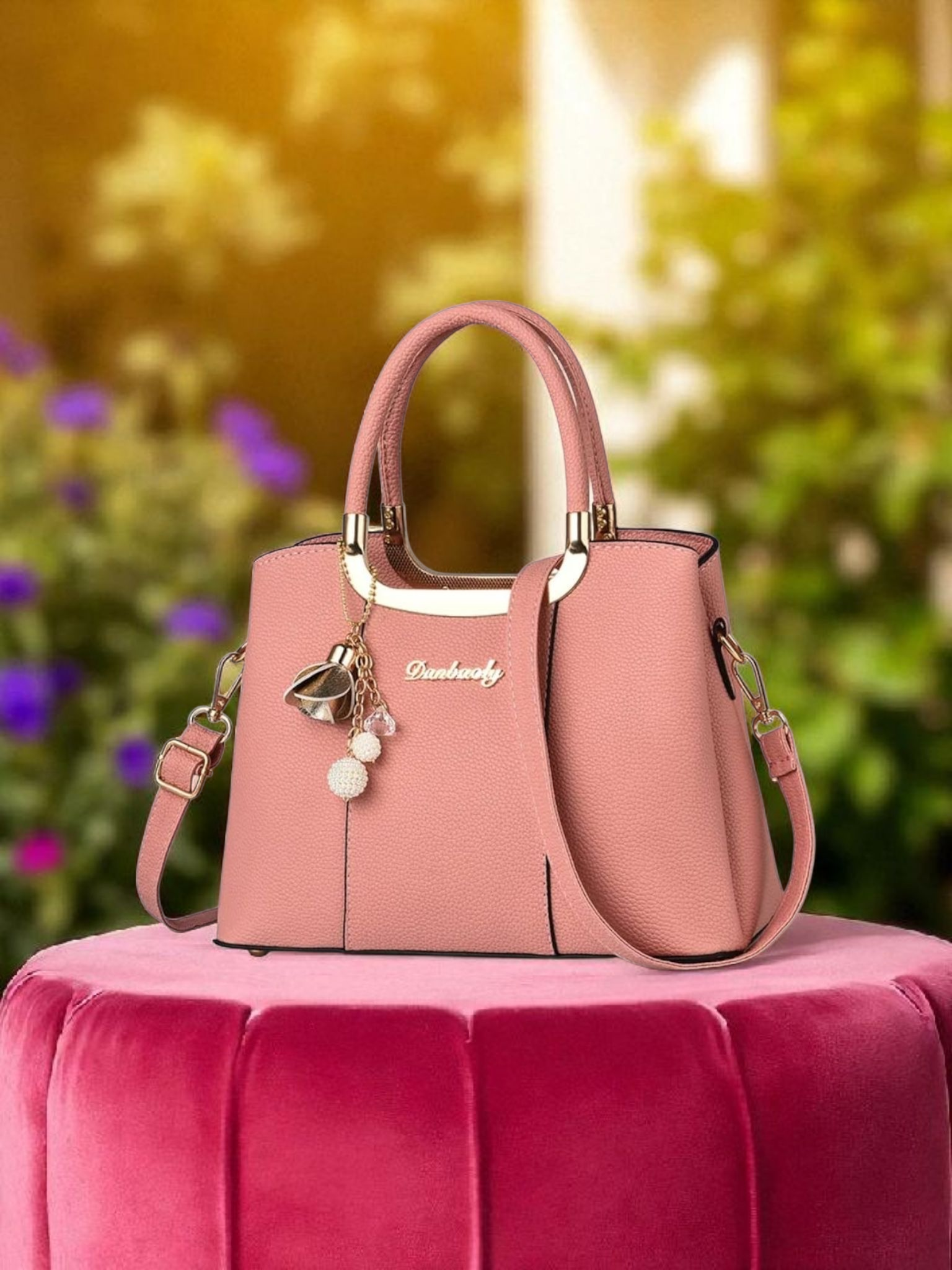 এটি 'Danbaoly' ব্র্যান্ডের একটি খুব সুন্দর ও আকর্ষণীয় হ্যান্ডব্যাগ। এর গোলাপি রং এবং চামড়ার মতো টেক্সচার এটিকে একটি আভিজাত্যপূর্ণ চেহারা দিয়েছে। ব্যাগের সামনে সোনালি রঙের লোগো এবং এর সাথে ঝোলানো স্টাইলিশ ট্যাসেল এটিকে আরও আকর্ষণীয় করে তুলেছে। এতে একটি সহজে বহনযোগ্য হ্যান্ডেল এবং একটি সামঞ্জস্যযোগ্য স্ট্র্যাপ রয়েছে, যা এটিকে কাঁধে বা হাতে বহন করার সুবিধা দেয়। অফিস, পার্টি বা দৈনন্দিন ব্যবহারের জন্য এটি দারুণ উপযোগী। যারা স্টাইল এবং রুচিশীলতার এক দারুণ মিশ্রণ খুঁজছেন, তাদের জন্য এটি একটি পারফেক্ট পছন্দ।