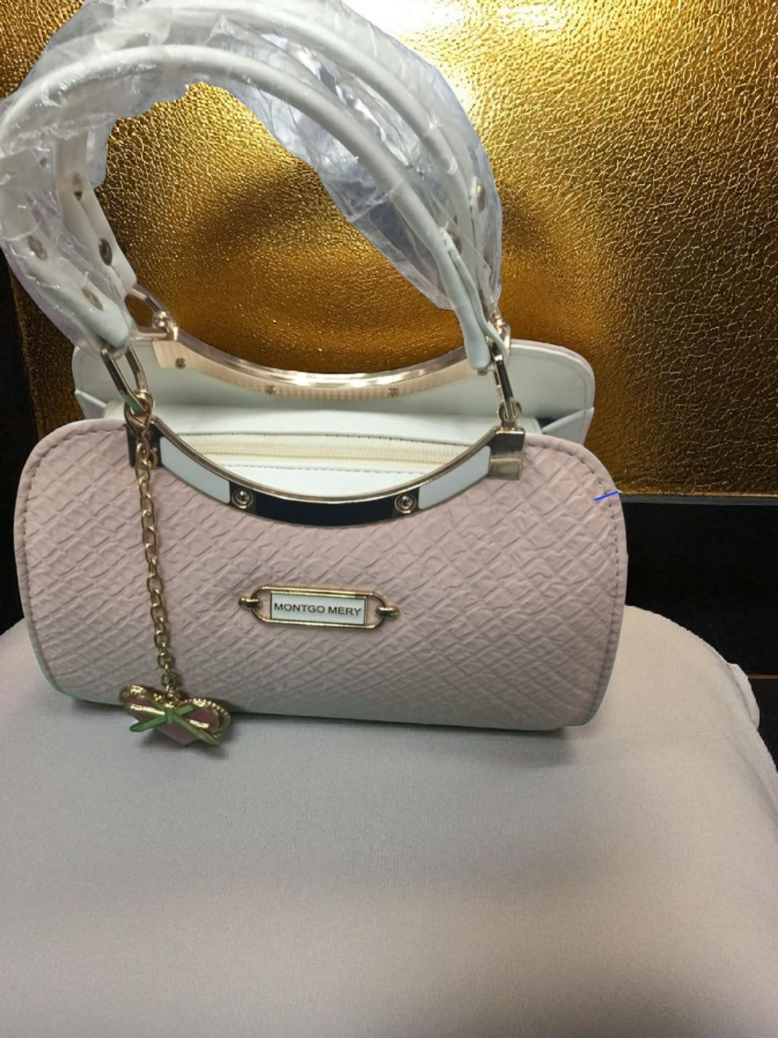 এই সুন্দর পিঙ্ক মিনি হ্যান্ডব্যাগটি আধুনিকতার সাথে আভিজাত্যের এক চমৎকার মিশ্রণ। এর টেক্সচার্ড ম্যাটেরিয়াল এবং 'MONTGO MERY' লোগো ব্যাগের ডিজাইনকে আরও উন্নত করেছে। ব্যাগটির উপরের অংশে থাকা সাদা হ্যান্ডেল এবং গোল্ডেন ডিটেইলিং এটিকে একটি মার্জিত লুক দেয়, যা যেকোনো অনুষ্ঠানে আপনার স্টাইলকে আরও আকর্ষণীয় করে তুলবে।